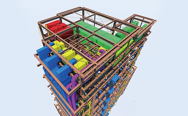 基礎・鉄骨や設備モデル、照明、仕上げ等のモデルを一つに統合し、可視化することで工事着手前のお客様との合意形成はもとより、意匠~構造~設備設計の工種ごとの干渉チェックが可能になり、品質向上及び業務の効率化につながります。