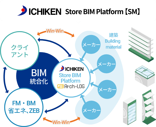 建設業のあらゆる工程において飛躍的な効率化・精度向上を可能にするBIM オブジェクト総合検索プラットフォーム「Arch-LOG」を運営する丸紅アークログ株式会社様と共同で、BIMオブジェクトの拡充と同プラットフォームの活用を目的としたアライアンス事業を進めています。「Arch-LOG」により什器配置から店舗照度まで完成画像で検討が可能となり、より現実的な提案力が生まれ生産性が向上。店舗の効率化、省エネ化、ローコスト化をサポートします。