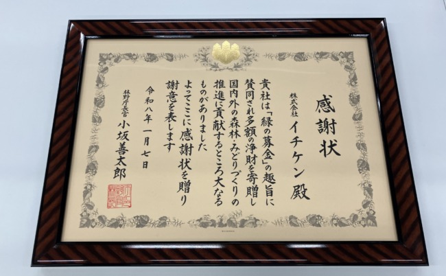 2026年/緑の募金 林野庁長官より「感謝状」を贈呈