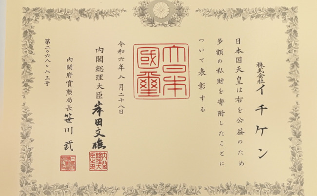 2023年10月にCSR(企業の社会的責任)の一環として行いました京都府への寄付に対し、公益のため寄附した法人に対して授与される「紺綬褒章」を受章いたしました。※2023年10月27日開催「水を想う、文化を想う、平和を想う」ゼロからの祈りコンサートに協賛