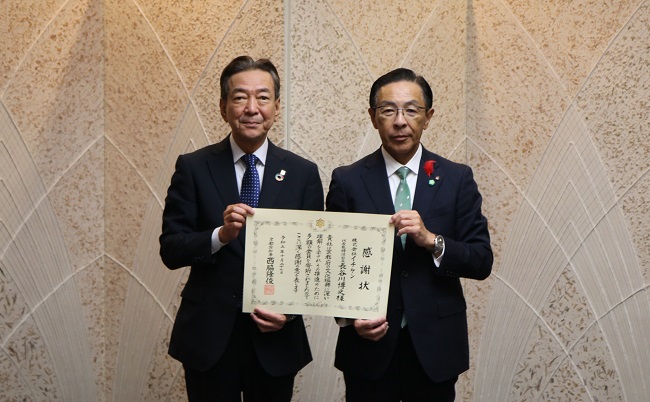 2023年10月27日、京都市の東寺で行われた「水を想う、文化を想う、平和を想う」ゼロからの祈りコンサートに協賛しました。CSR(企業の社会的責任)の一環として、「企業による文化や芸術活動への支援」(メセナ活動)を通じて、当社の企業姿勢や社名のPRにつながる取り組みを行いました。またイベントに先立ち、京都府の西脇知事から当社の支援に対する感謝状が贈呈されました。