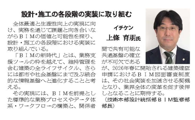 「BIM2025特集号」新聞掲載 2025年5月29日発刊の 日刊建設通信新聞 「BIM2025特集号」において、技術本部 設計統括部 BIM監修部の上條部長のコメントが広告と共に掲載されました。