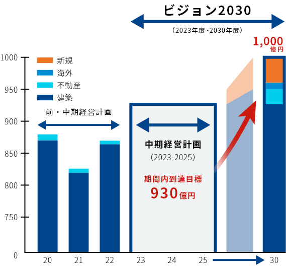 - 01基幹の建築事業を安定・充実させ、不動産・海外事業を戦略事業として拡充を行い、新規事業を含めた業容の拡大を目指す